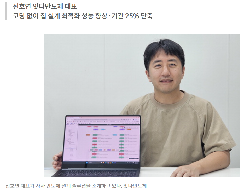 5일 경기 화성 동탄 본사에서 만난 전호연 잇다반도체 대표는 “설계 업무를 할 때 코딩하는 인력과 시간도 문제지만 데이터를 주고받는 업무가 비효율적이기 때문에 이를 줄이면 생산성을 높일 수 있겠다 싶어 창업했다”며 “우리 기술로 설계 기간을 25% 단축할 수 있을 것”이라고 말했다.